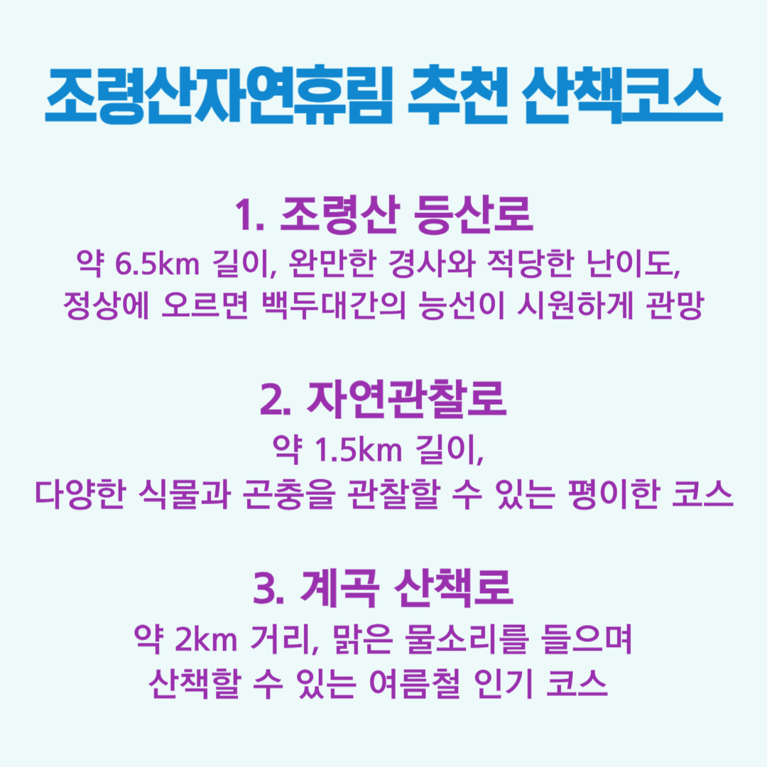 - 자연관찰로: 약 1.5km 길이로, 아이들이나 어르신들도 부담 없이 걸을 수 있는 코스입니다. 다양한 식물과 곤충을 관찰할 수 있어 교육적이기도 합니다.